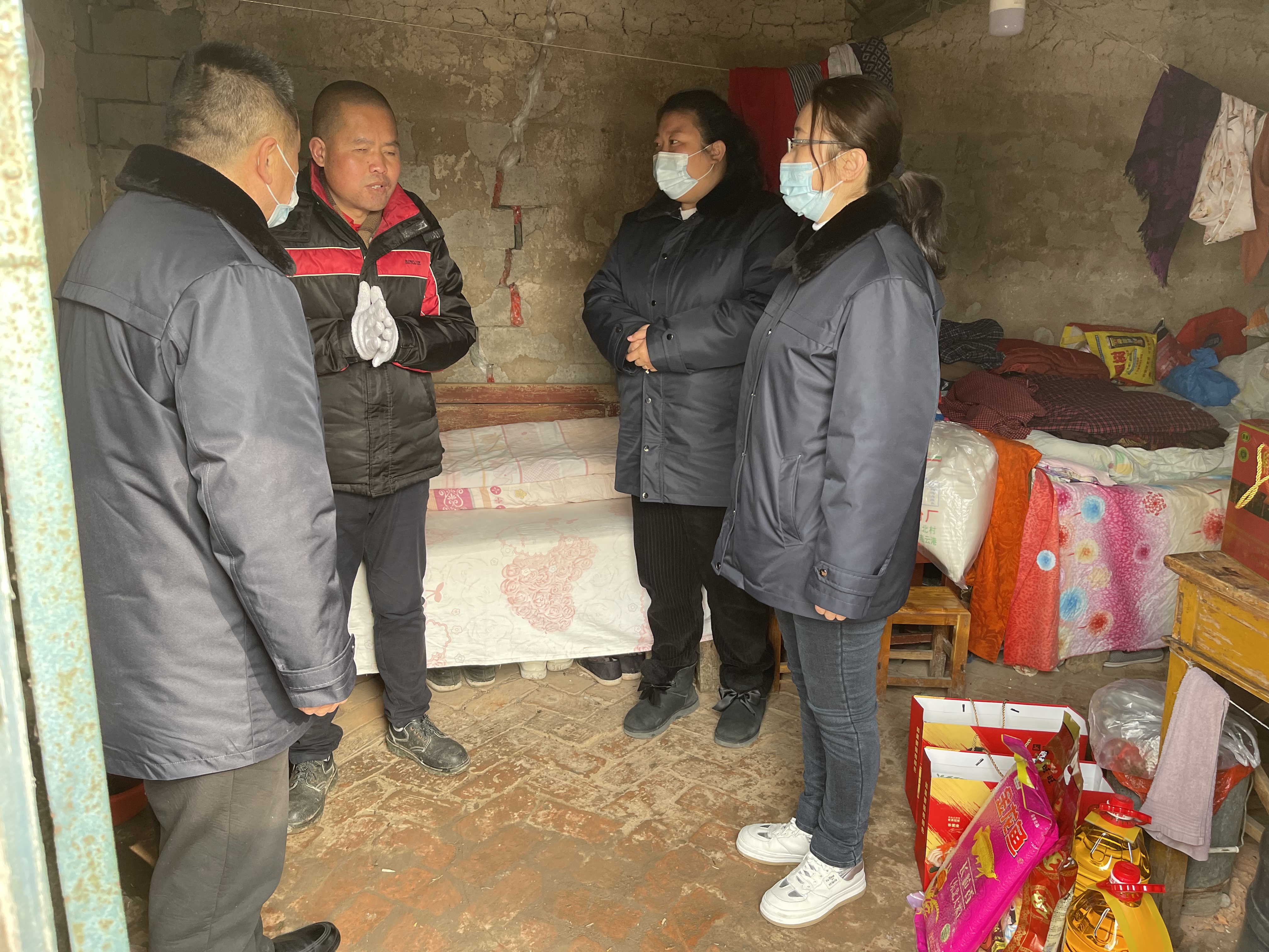 徐恒光,浦南镇浦北村棚户区的一个普通农民,43岁的他因幼时的一起机器爆炸导致双目失明,脾脏切除,丧失劳动能力,仅与老母亲靠村上每月几百元的救助相依为命,生活十分拮据。事业一部一行人来到徐恒光的家中,为他送上了食用油、米、面、牛奶等物品,与他亲切交谈,详细询问他的身体状况,饮食起居等情况,鼓励他要坚定信心,战胜困难,勇敢面对生活,并为他送上了新年祝福。