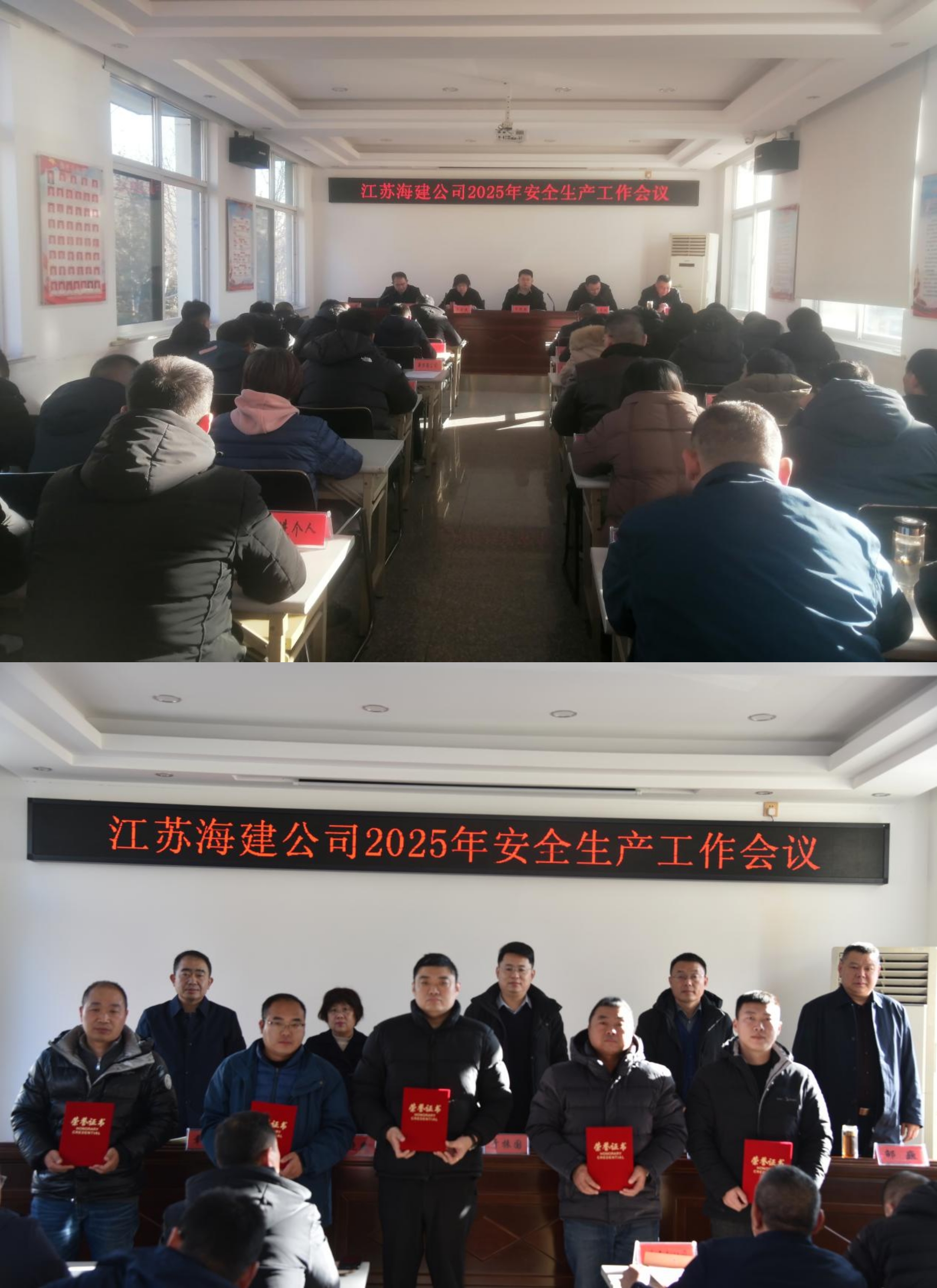 会上,海建公司安全工作分管领导章海涛对2024年安全生产工作进行汇报,总结2024年度工作并对2025年安全生产工作进行部署。纪委书记韦晓燕宣读《关于表彰2024年度安全生产先进单位的决定》,副总经理邵巍宣读《关于表彰2024年度安全生产先进班组和先进个人的决定》,并进行颁奖。各分(子)公司主要负责人向公司总经理徐其翔递交2025年安全生产目标管理责任书,徐其翔就贯彻落实此次会议精神和春节期间安全生产工作提出要求:一要认真贯彻落实本次会议精神;二要强化安全生产责任制的落实;三要切实落实安全生产各项防范措施;四要扎实做好春节期间安全工作;五要加强应急值班值守工作。