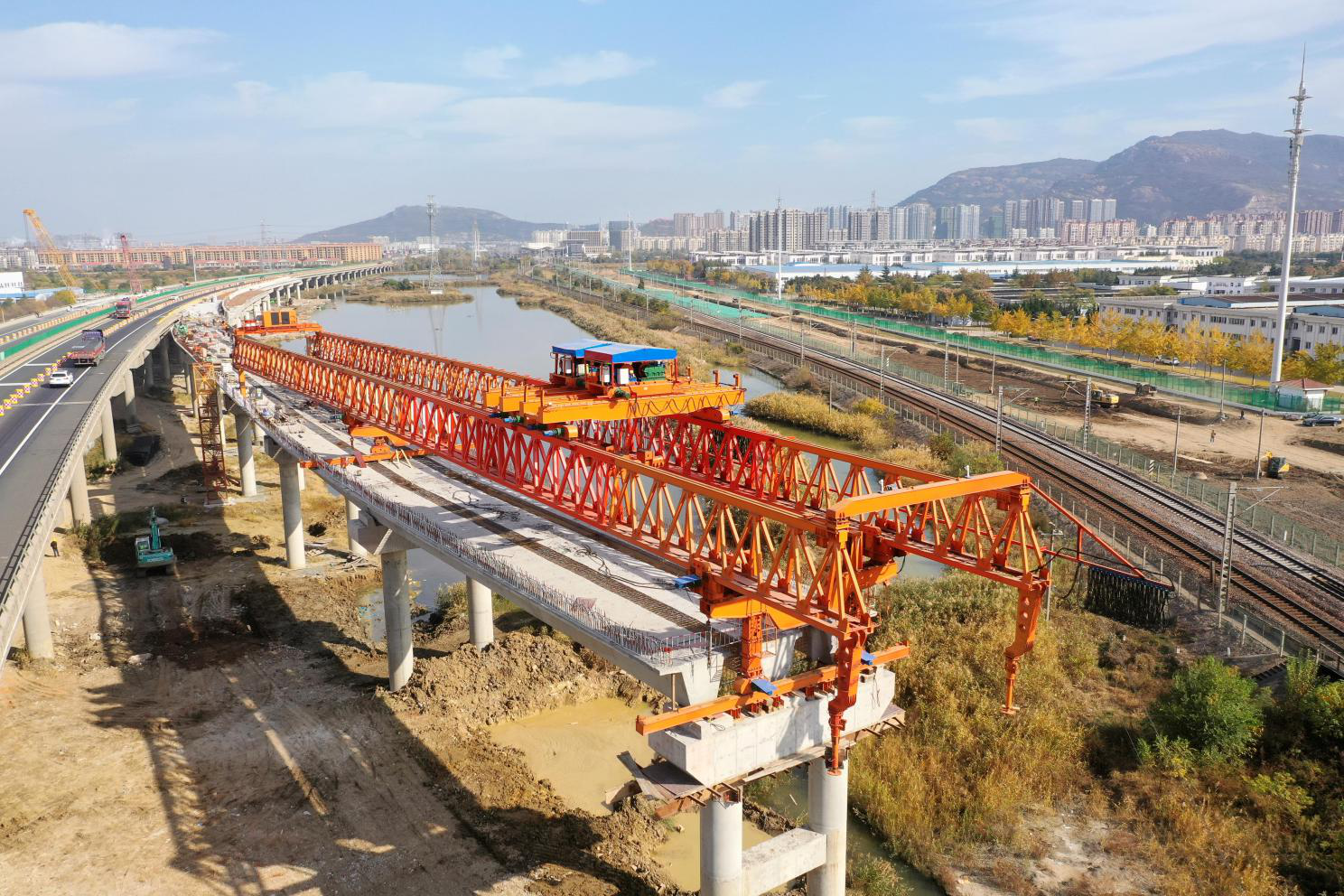 D匝道陇海铁路北侧共完成箱梁架设51片,箱梁架设完成后将继续开展桥面施工。因跨越铁路架梁必须申报铁路封锁施工计划,因此D匝道跨铁路箱梁架设将待E匝道铁路北侧箱梁架设完成后一并实施过跨封锁施工。预计11月底完成E匝道北侧架梁,铁路跨架梁计划在12月中旬完成。