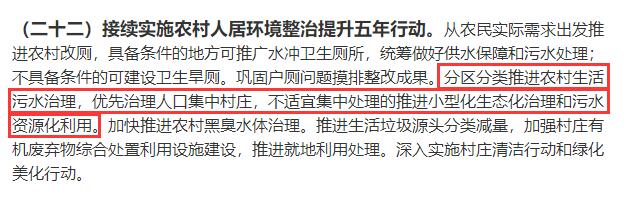 在扎实稳妥推进乡村建设部分,文件提出:分区分类推进农村生活污水治理,优先治理人口集中村庄,不适宜集中处理的推进小型化生态化治理和污水资源化利用。