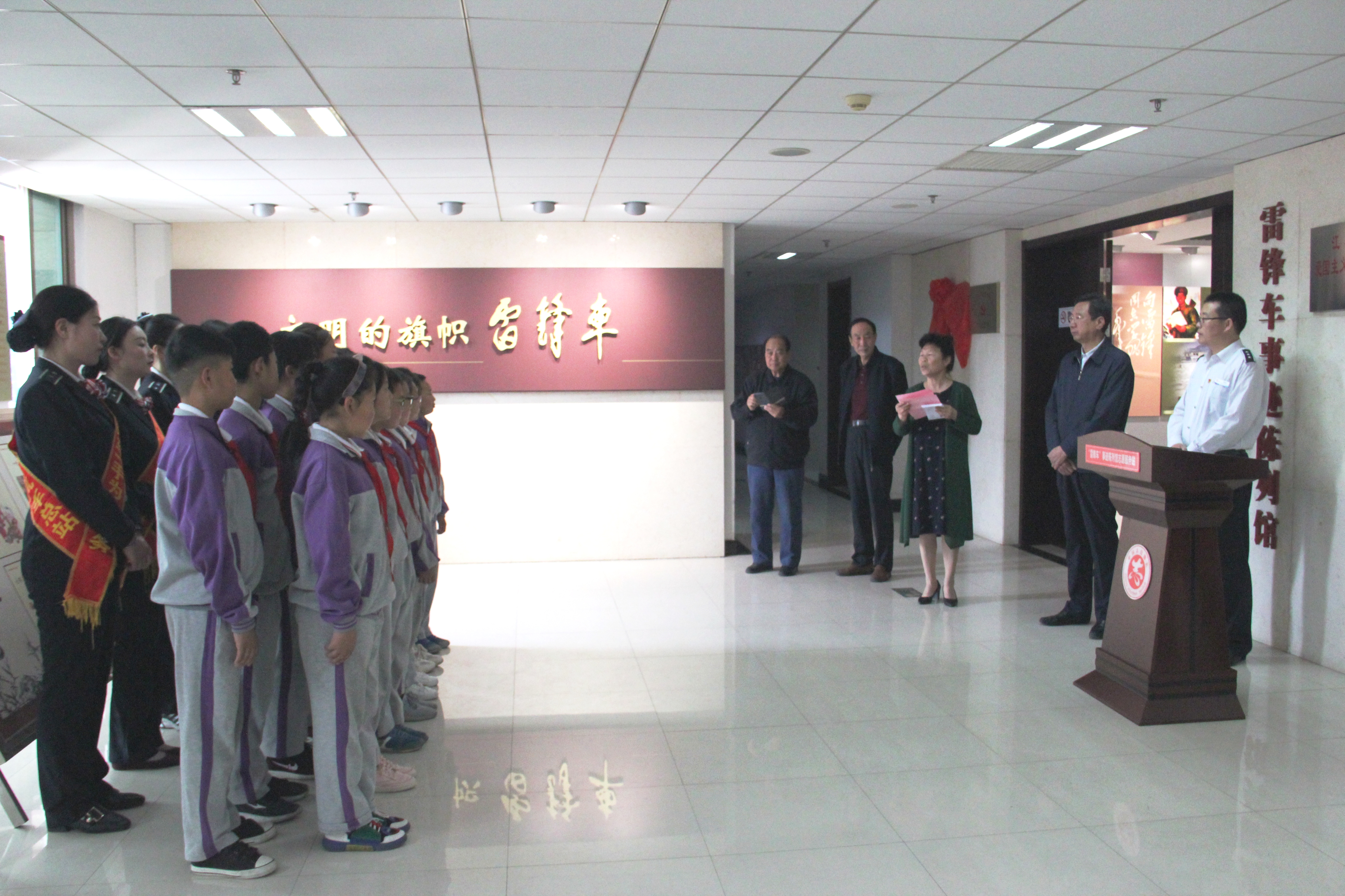 仪式上,双方领导分别发表致辞,学生代表宣读了倡议书。胡海玲表示,“雷锋车”组是我市精神文明建设的旗帜,是学雷锋活动的领头人。此次“学雷锋实践基地”揭牌,将为广大青少年提供爱国主义教育、思想道德建设、革命传统教育等重要场所,希望广大青少年能够传承和发扬“雷锋车”精神,全面提升自身素质,实现少年梦。刘佃华在致辞中表示,“雷锋车”组具有56年的发展历程,获得国家级荣誉多项,培养了三位四届全国人大代表,获得了广大人民群众的广泛赞誉。希望“雷锋车”组今后继续发扬“宁愿自己千般苦,不让旅客一时难”的精神,不断拓展服务内容,提升服务质量,把青少年“学雷锋实践基地”打造成促进青少年全面发展的活动平台,引导广大青少年努力学习,奋发向上,传承优秀品质,精心教育每个学生都能成为学雷锋多做贡献的优秀人才。