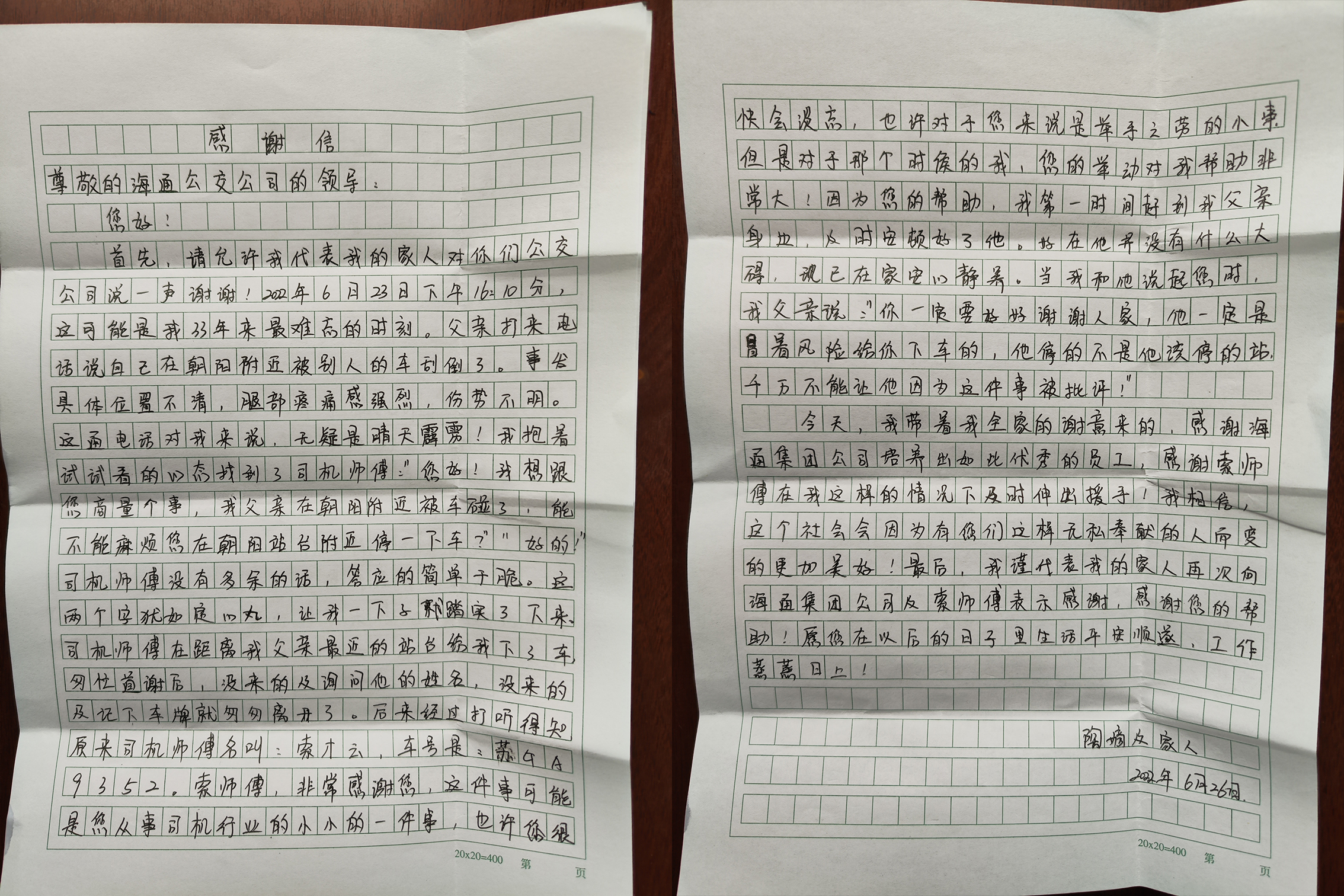 6月27日下午,陶女士找到索才云上班的地方,送来了写满两页的感谢信,信中写到:“这件事可能是您从事司机行业小小的一件事,也许您很快会淡忘,也许对于您来说是举手之劳的小事,但是对于那个时候的我,您的举动对我帮助非常大!因为您的帮助,我第一时间赶到我父亲身边,及时安顿好了他。您冒着风险热心的让我下了车,我代表全家人感谢公交公司培养出如此优秀的员工!”