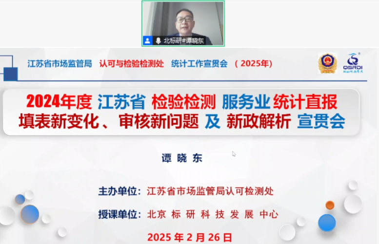 本次培训采用“标研云课堂”进行线上开展,由北标研专家谭晓东老师担任主讲。培训内容主要涉及三个方面:一是解析前期数据填报中发现的常见问题及检验检测机构填报注意事项;二是讲解2024年度检验检测服务业统计直报系统功能和数据项;三是解析2024年度新政策制度与《江苏省检验服务业统计工作管理办法》。培训过程中设置互动环节,帮助大家解决在工作过程中遇到的类似问题和困难。