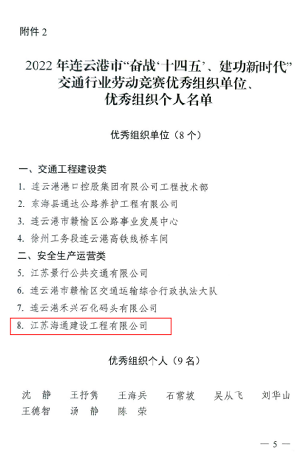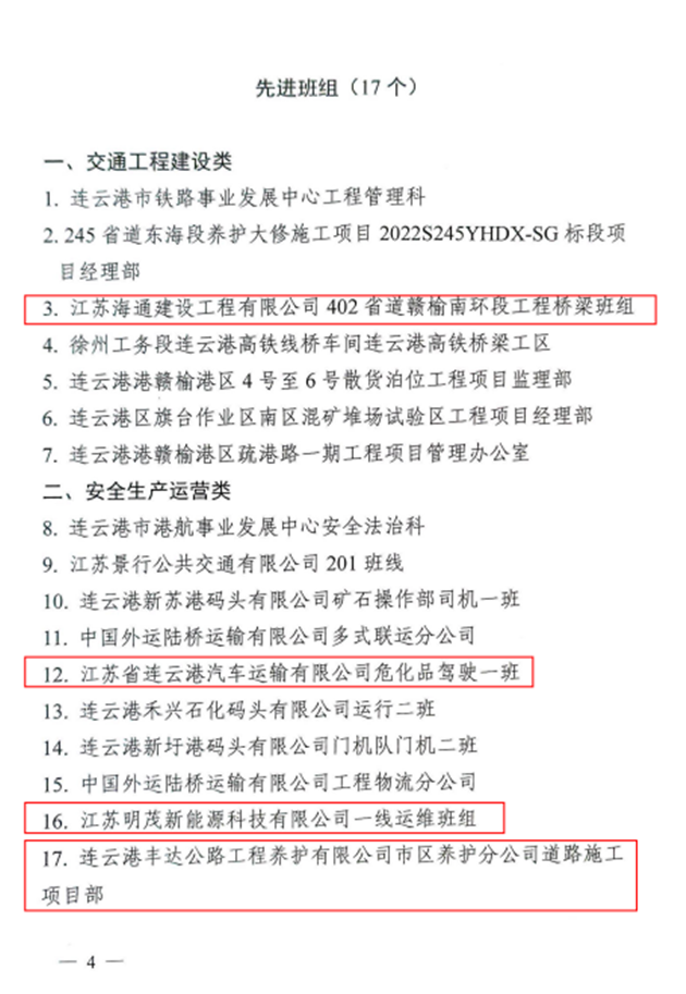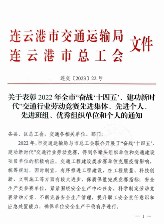 近日,从市总工会、市交通运输局传来喜讯,博鱼app最新版下载,博鱼(中国)权属公交博鱼app最新版下载,博鱼(中国)公交事业一部荣获2022年全市“奋战十四五、建功新时代”交通行业劳动竞赛先进集体,海建公司402省道赣榆南环段工程桥梁班组、汽车公司危化品驾驶一班、明茂新能源公司一线运维班组和丰达公司市区养护分公司道路施工项目部四个班组荣获先进班组,公交博鱼app最新版下载,博鱼(中国)周卓文被评为先进个人,海建公司被评为优秀组织单位。