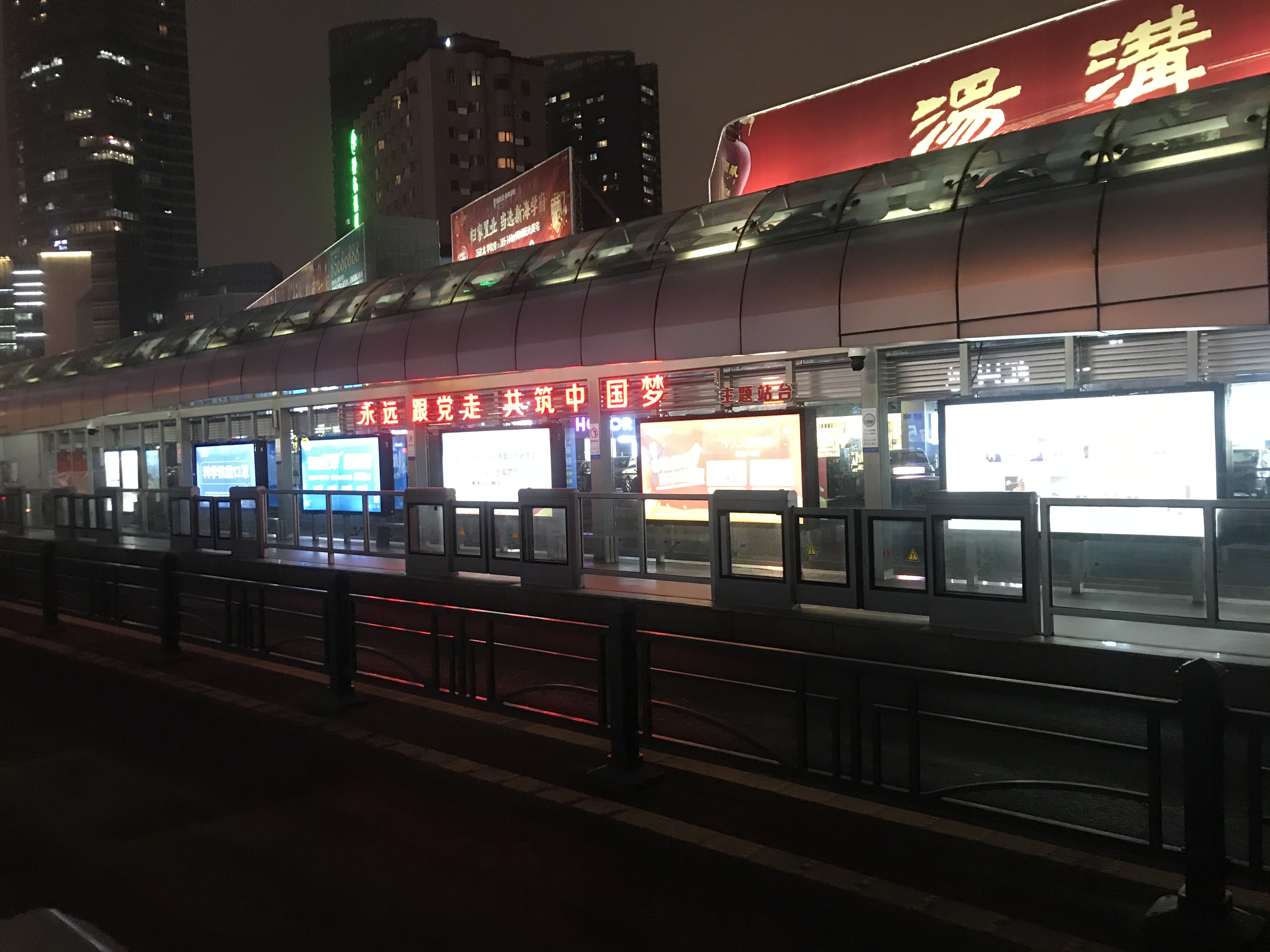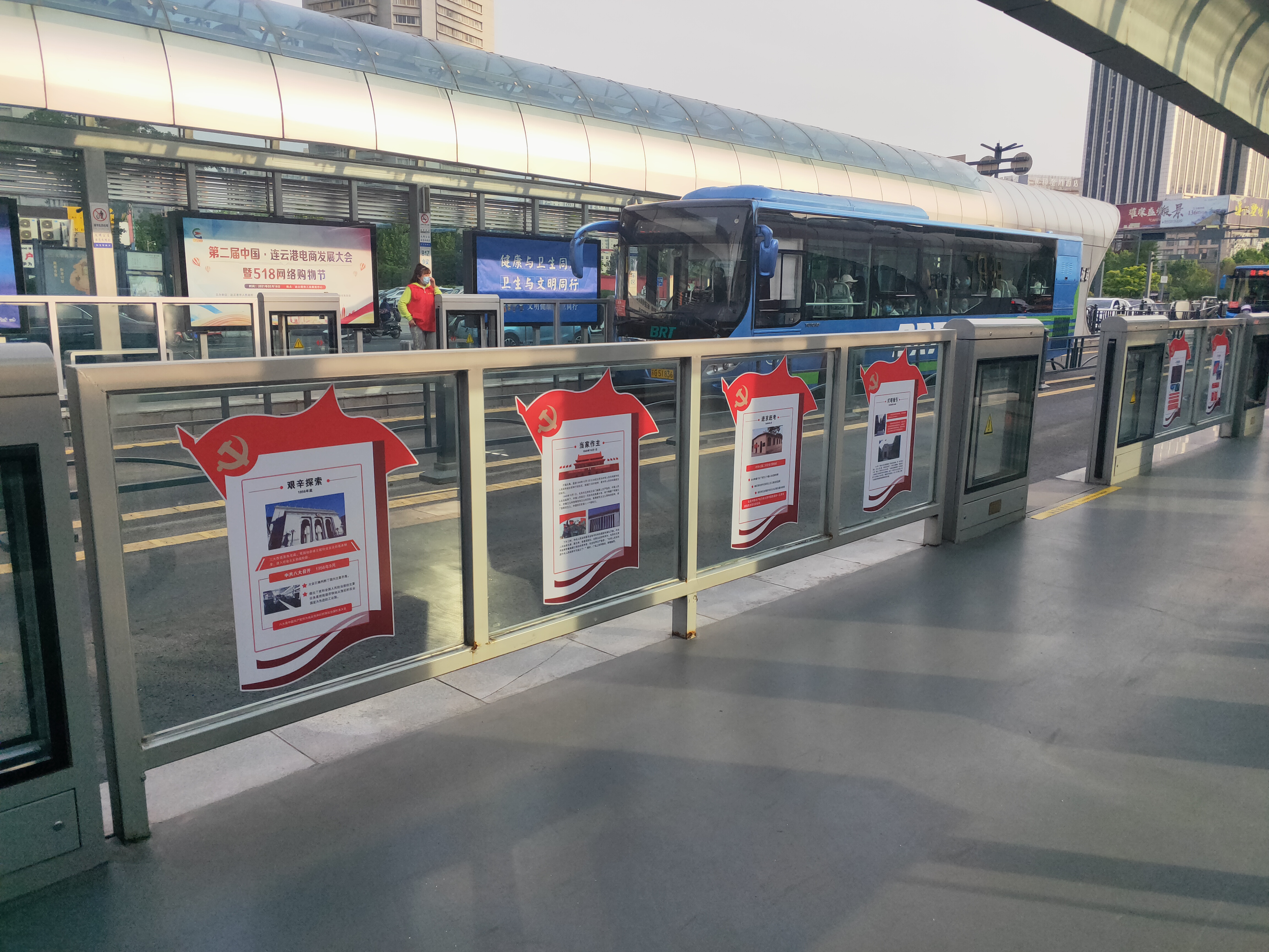 为庆祝建党百年、践行党史学习教育,依托BRT站台“窗口”优势和BRT“馨驿站”的打造,快速公交事业部在龙河广场下行站推出一款党史学习教育主题站台。根据乘客视角习惯,在站台的灯厢、安全门侧玻、顶部、墙面等醒目位置进行立体设计。以中国共产党党史为主要内容,红黄为主基调进行氛围渲染,浓淡相宜与站台环境相得益彰。乘客在耳濡目染中接受教育,增强时代的自豪感。